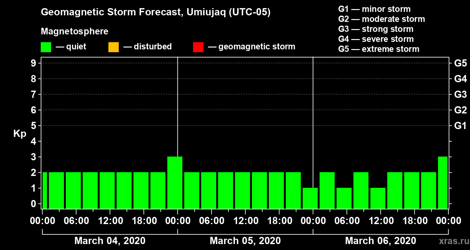 Geomagnetic storm forecast in Umiujaq for Mar 04, 2020