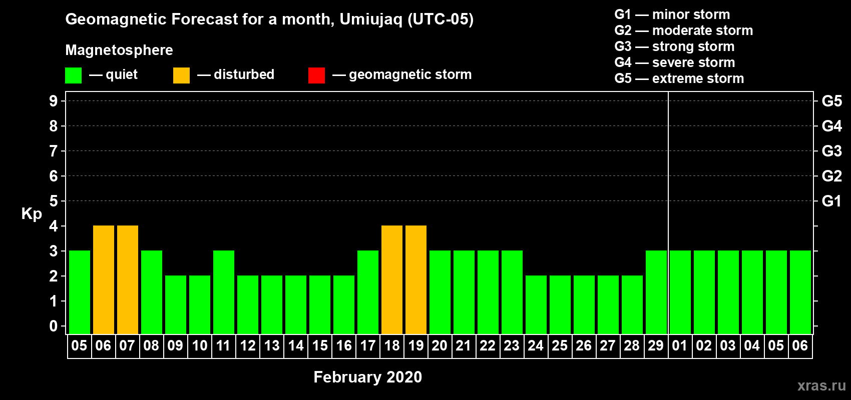 Geomagnetic storm forecast in Umiujaq for Feb 05, 2020