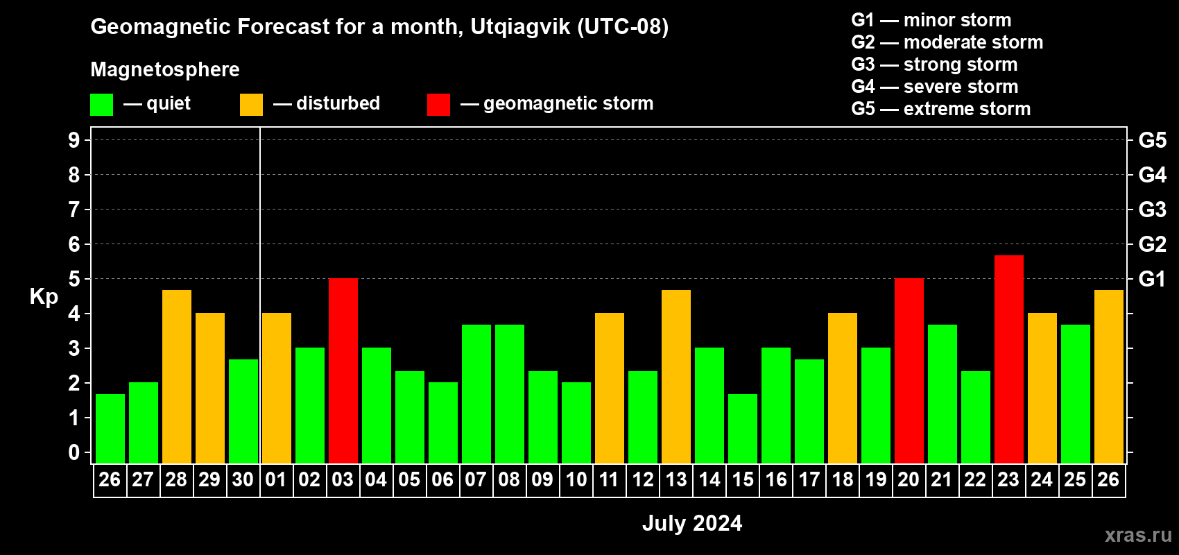 Geomagnetic storm forecast in Utqiagvik for Jun 26, 2024