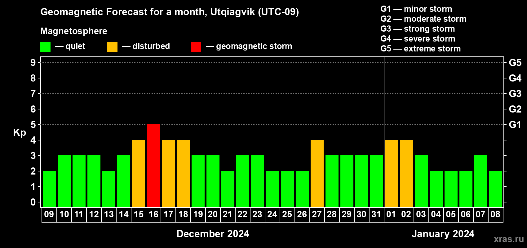 Geomagnetic storm forecast in Utqiagvik for Dec 09, 2023