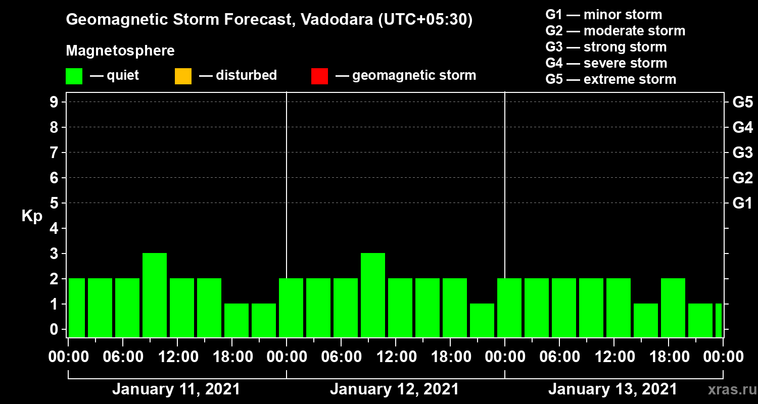 Geomagnetic storm forecast in Vadodara for Jan 11, 2021