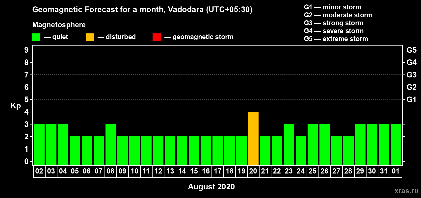 Geomagnetic storm forecast in Vadodara for Aug 02, 2020