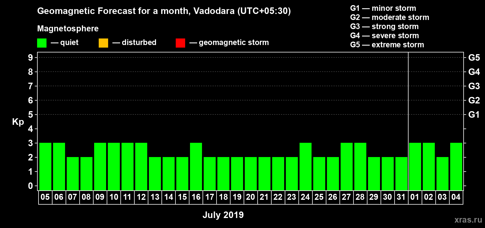 Geomagnetic storm forecast in Vadodara for Jul 05, 2019