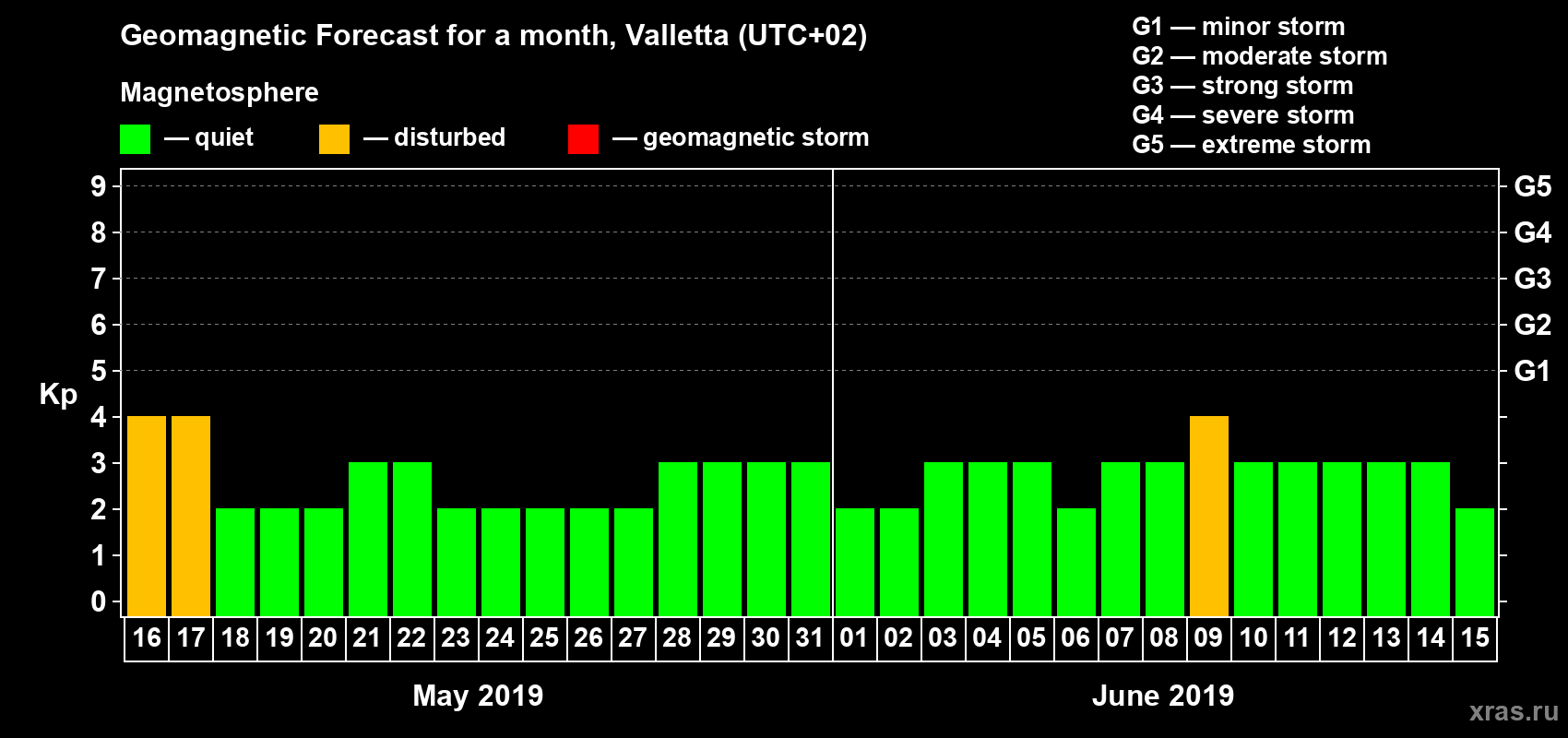 Geomagnetic storm forecast in Valletta for May 16, 2019