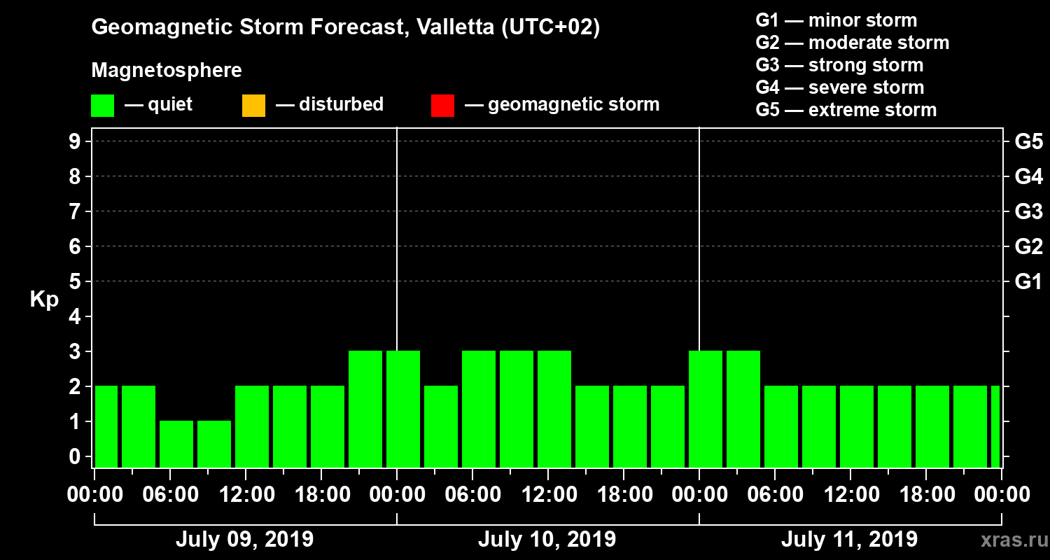 Geomagnetic storm forecast in Valletta for Jul 09, 2019