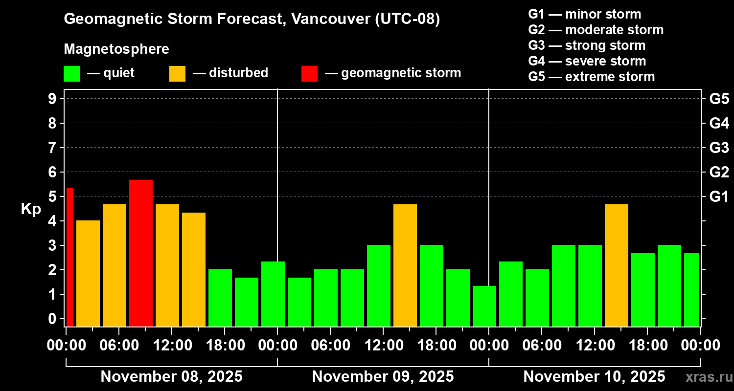 Geomagnetic storm forecast in Vancouver for Nov 08, 2025