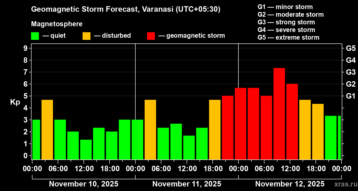 Geomagnetic storm forecast in Varanasi for Nov 10, 2025