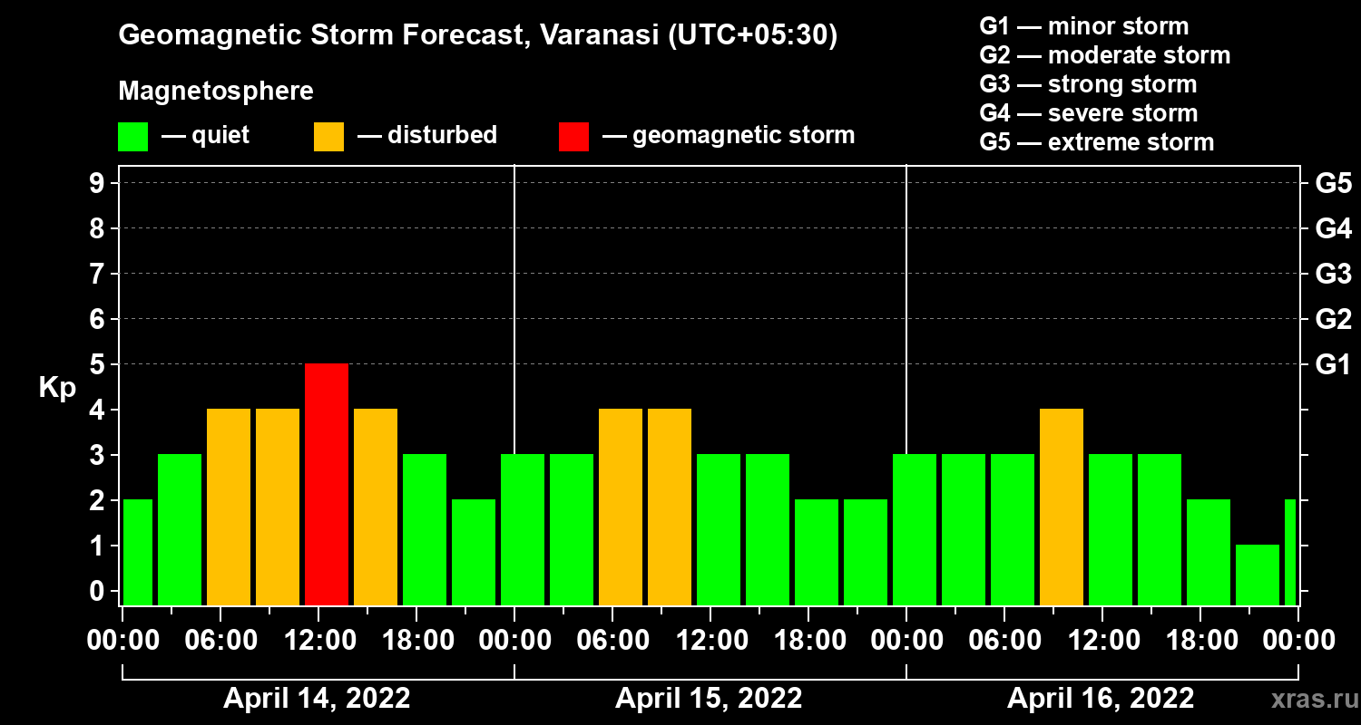 Geomagnetic storm forecast in Varanasi for Apr 14, 2022