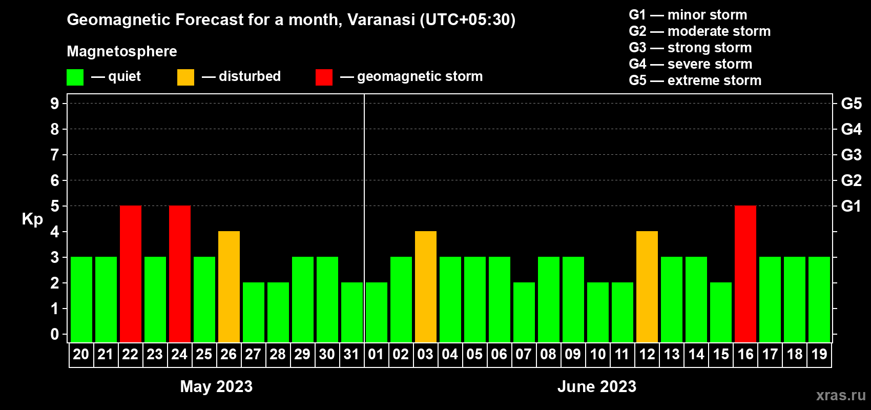 Geomagnetic storm forecast in Varanasi for May 20, 2023