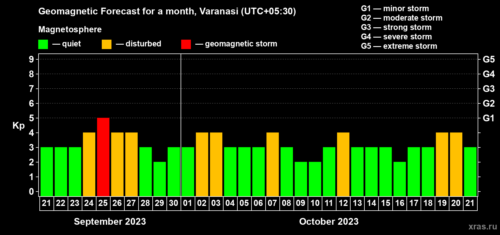 Geomagnetic storm forecast in Varanasi for Sep 21, 2023