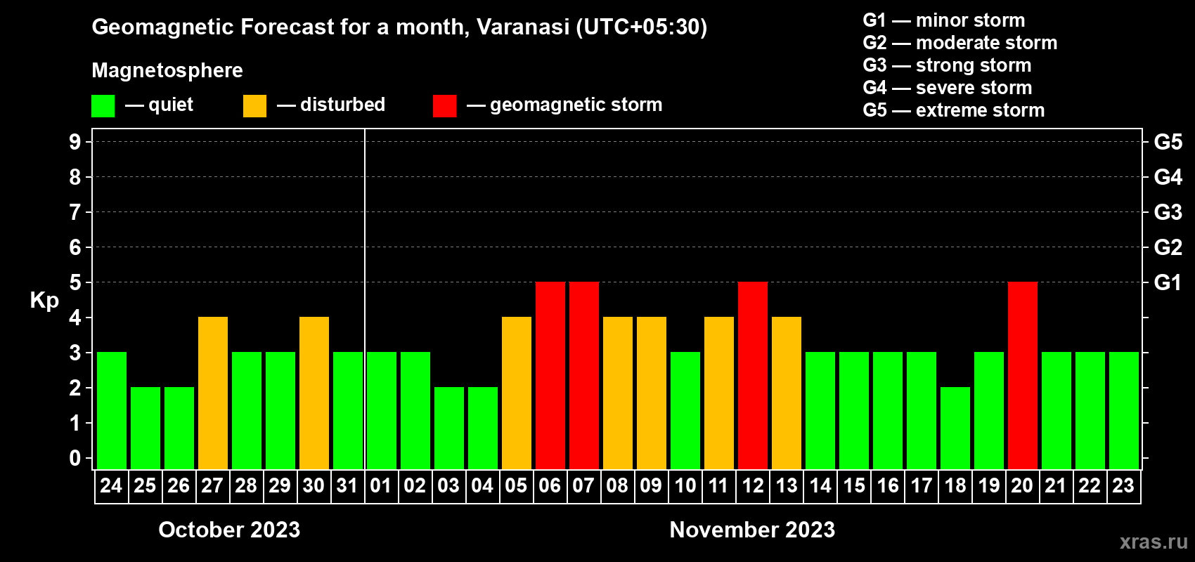 Geomagnetic storm forecast in Varanasi for Oct 24, 2023