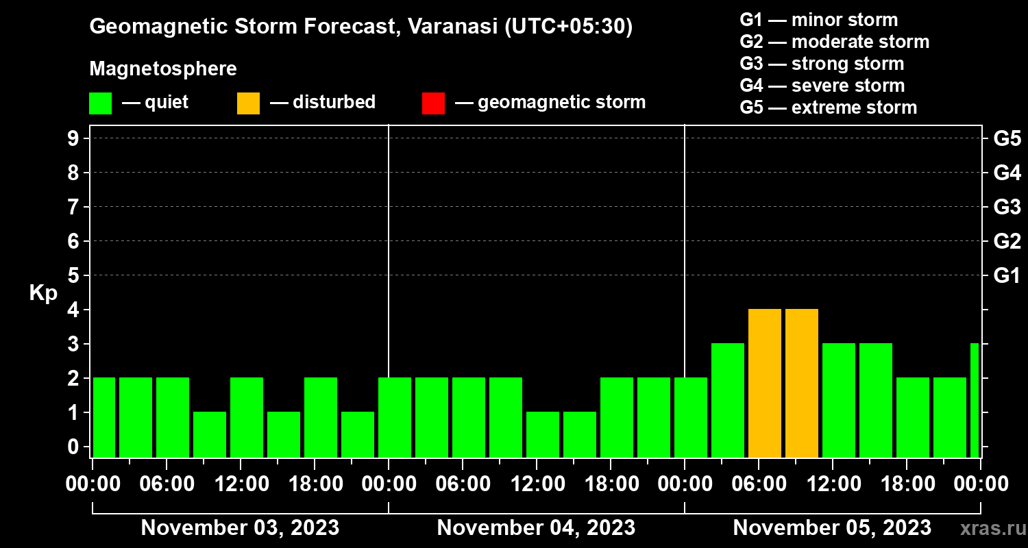 Geomagnetic storm forecast in Varanasi for Nov 03, 2023