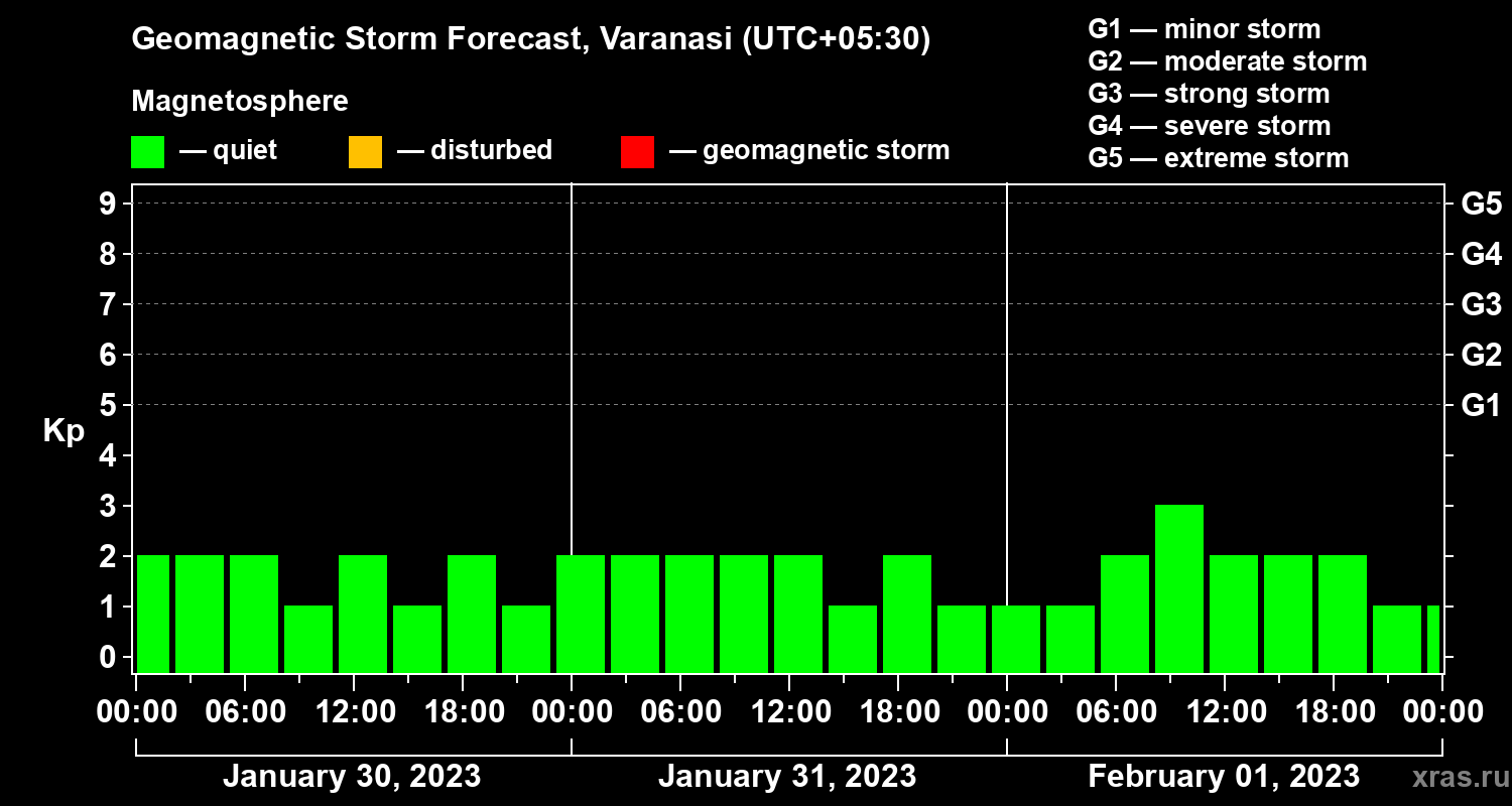 Geomagnetic storm forecast in Varanasi for Jan 30, 2023
