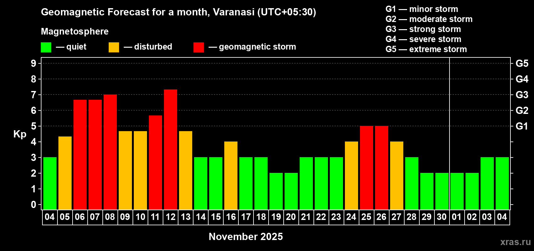 Geomagnetic storm forecast in Varanasi for Nov 04, 2025