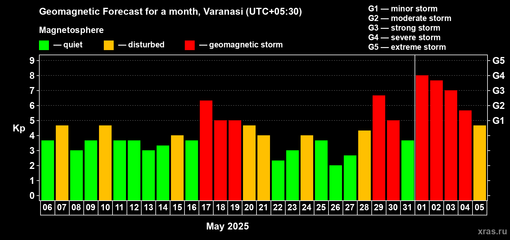 Geomagnetic storm forecast in Varanasi for May 06, 2025