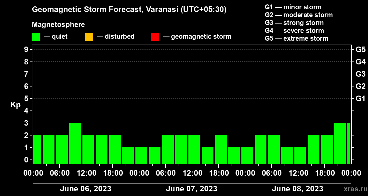 Geomagnetic storm forecast in Varanasi for Jun 06, 2023