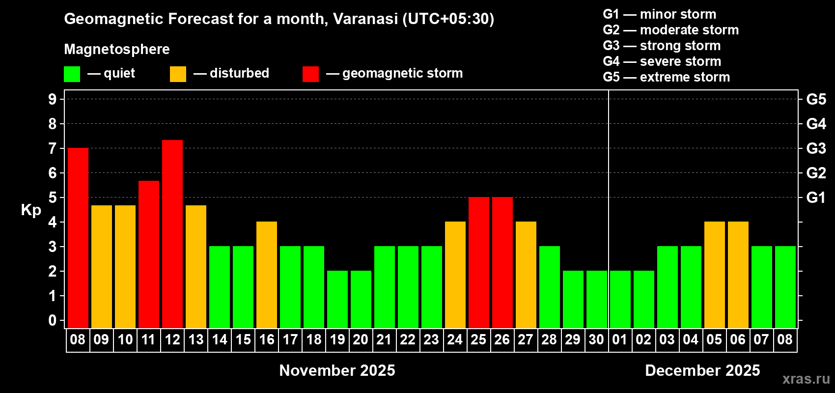 Geomagnetic storm forecast in Varanasi for Nov 08, 2025