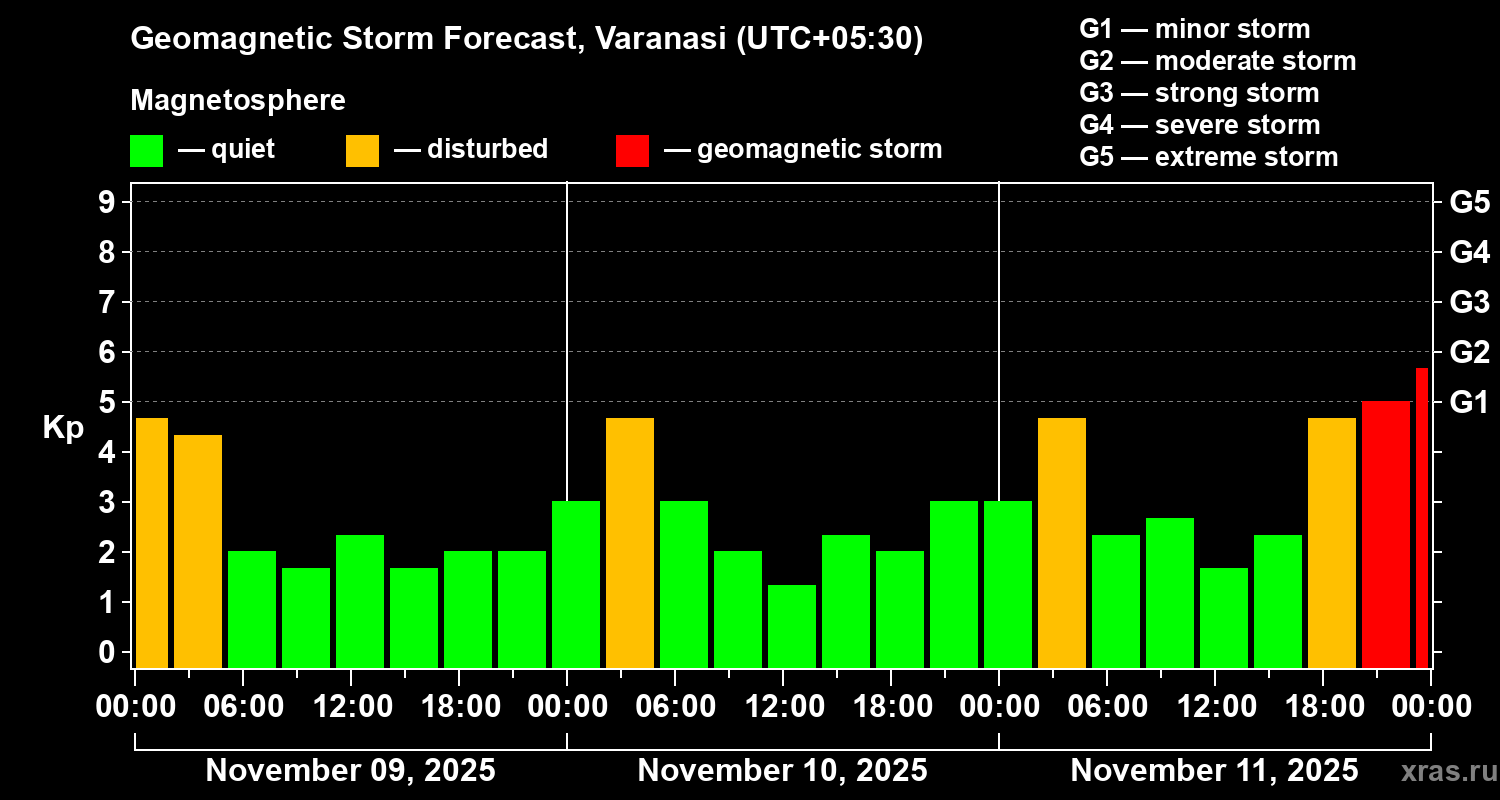 Geomagnetic storm forecast in Varanasi for Nov 09, 2025