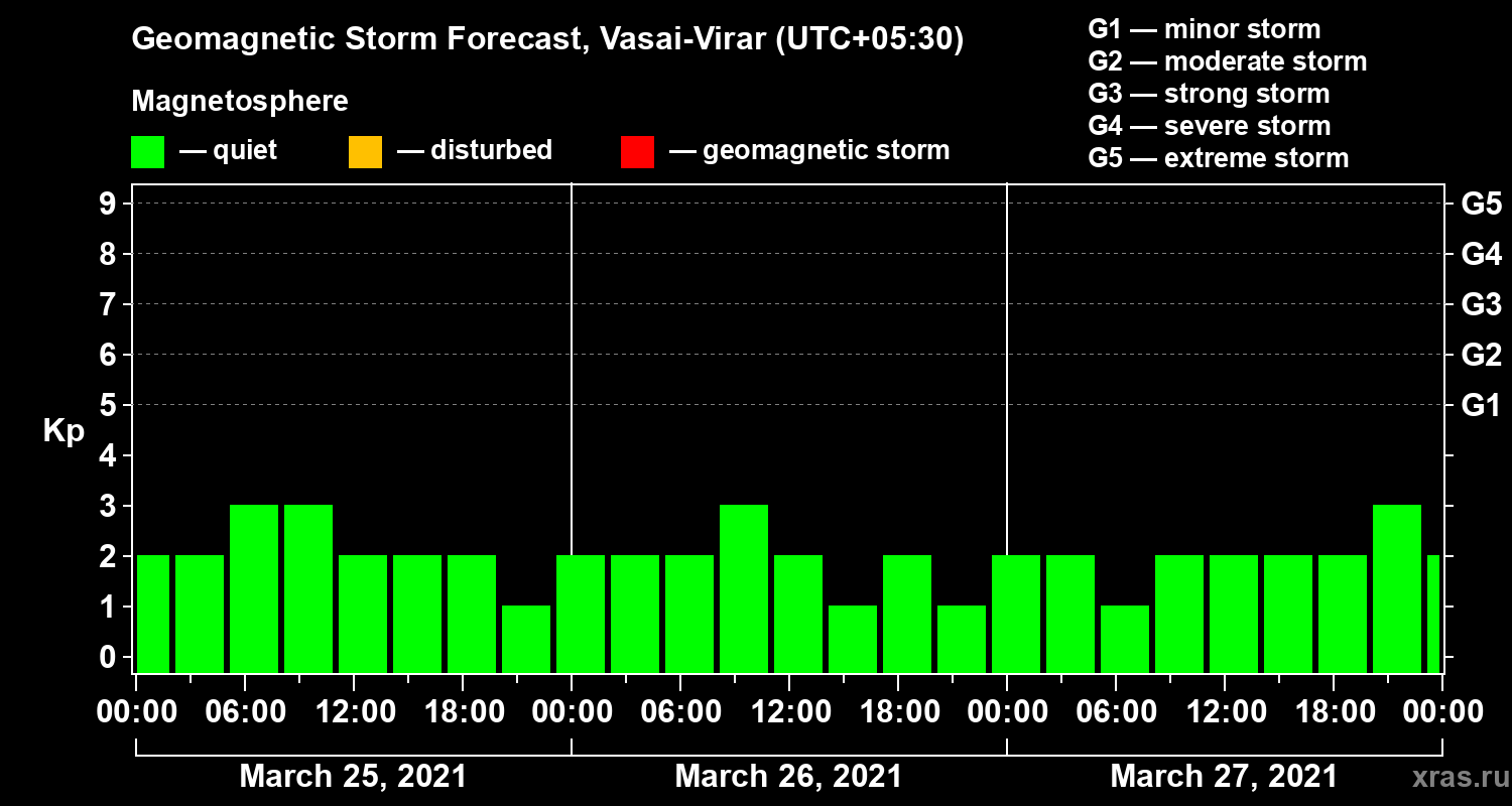 Geomagnetic storm forecast in Vasai-Virar for Mar 25, 2021