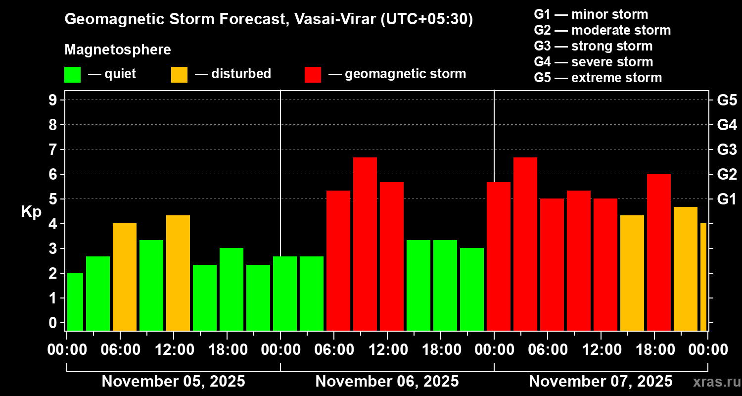 Geomagnetic storm forecast in Vasai-Virar for Nov 05, 2025