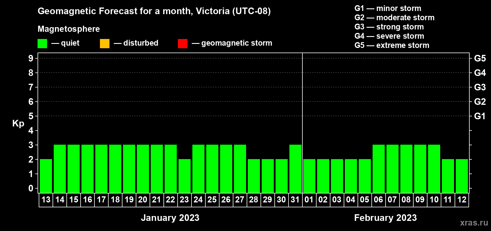 Geomagnetic storm forecast in Victoria for Jan 13, 2023