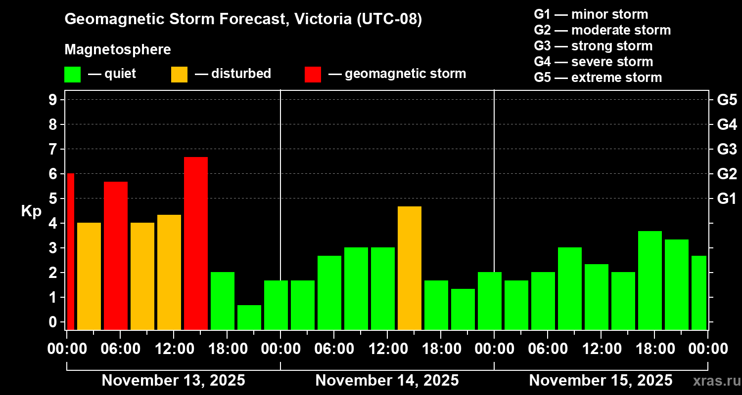 Geomagnetic storm forecast in Victoria for Nov 13, 2025