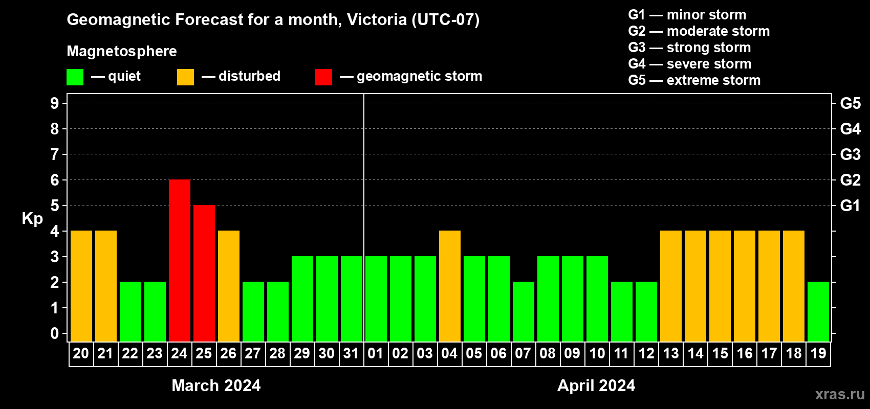 Geomagnetic storm forecast in Victoria for Mar 20, 2024