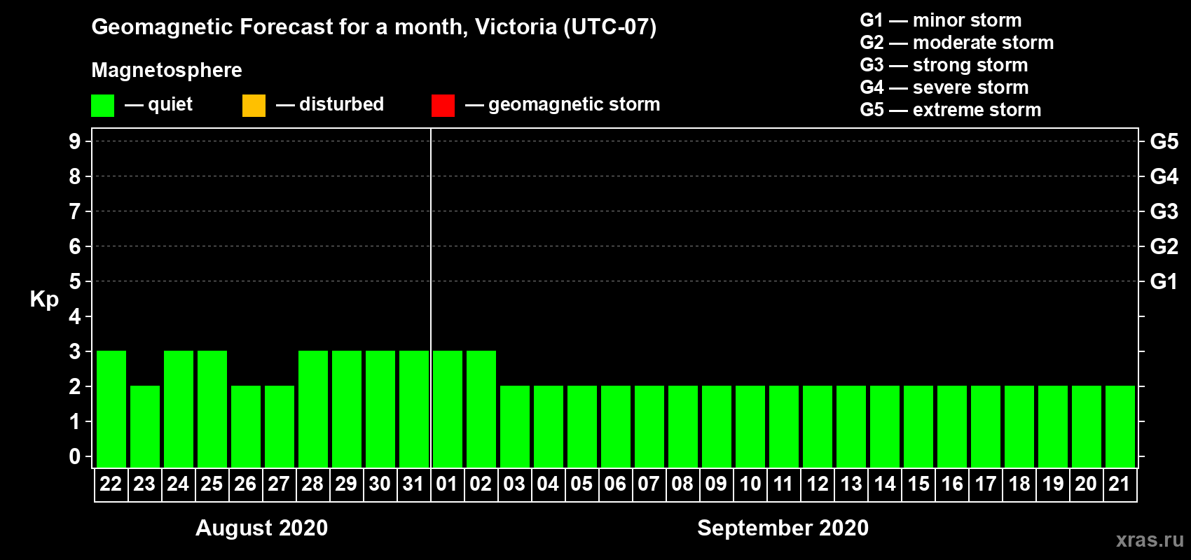 Geomagnetic storm forecast in Victoria for Aug 22, 2020