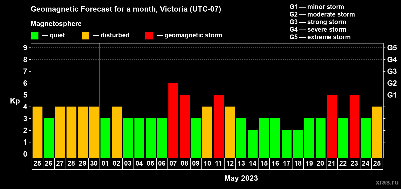 Geomagnetic storm forecast in Victoria for Apr 25, 2023
