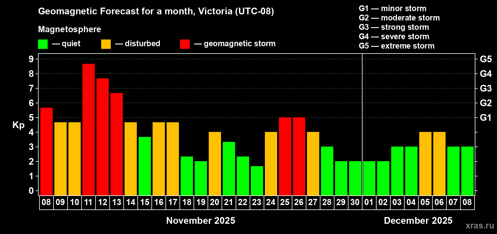 Geomagnetic storm forecast in Victoria for Nov 08, 2025
