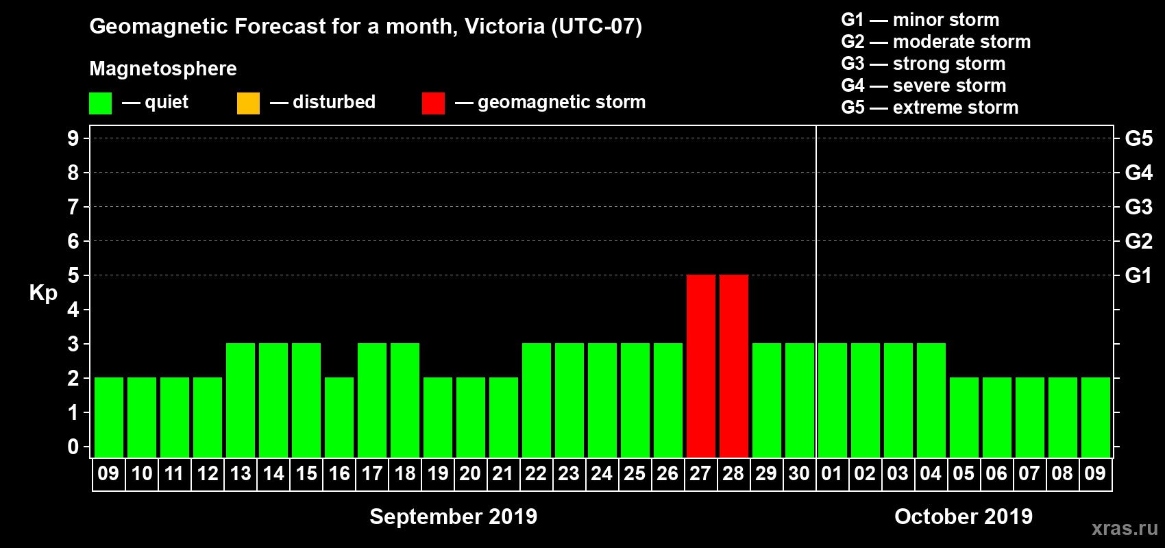 Geomagnetic storm forecast in Victoria for Sep 09, 2019