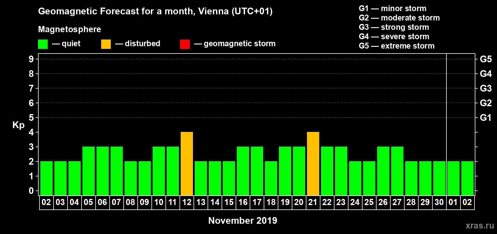 Geomagnetic storm forecast in Vienna for Nov 02, 2019