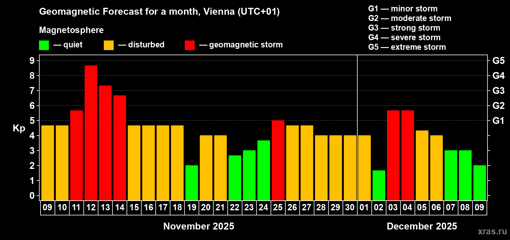 Geomagnetic storm forecast in Vienna for Nov 09, 2025