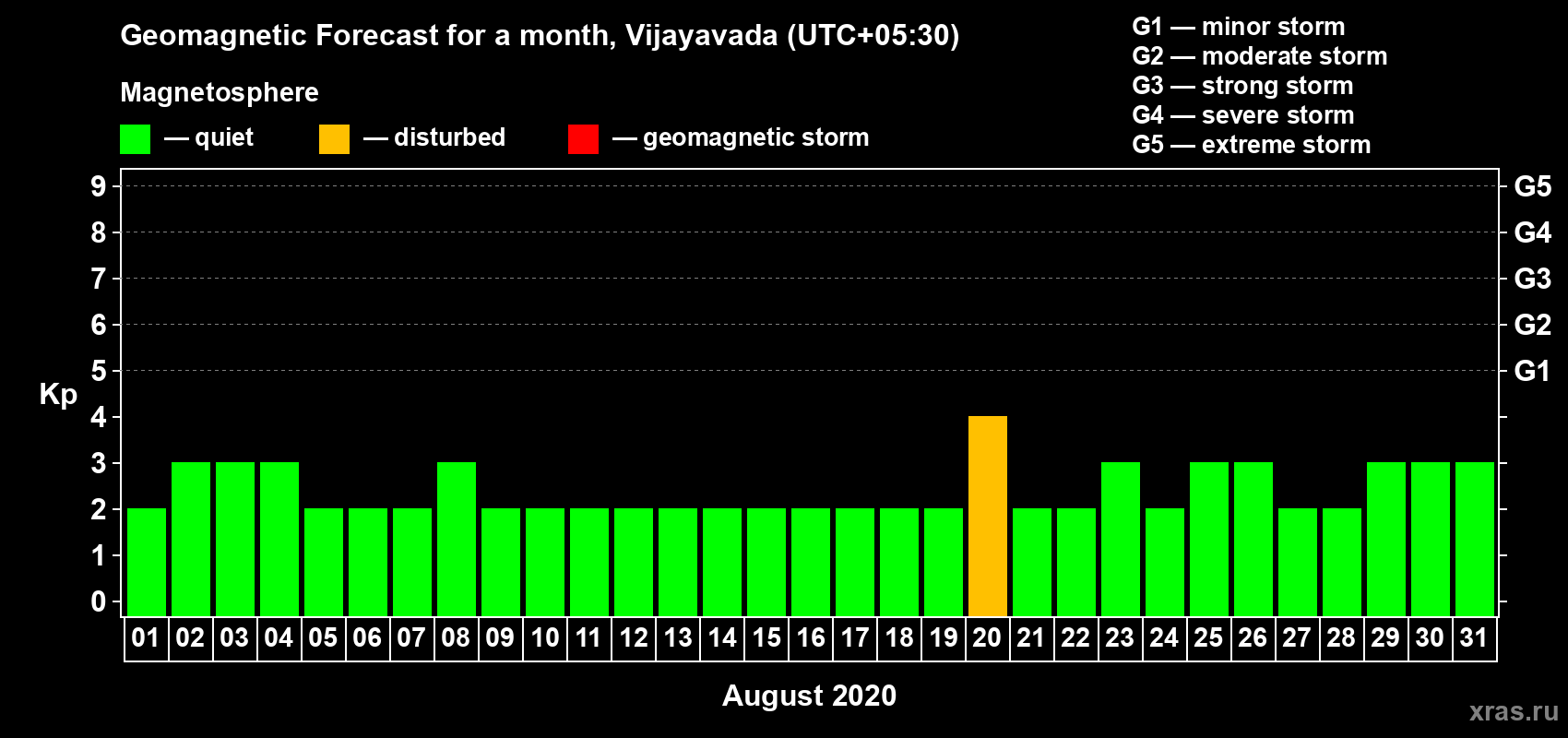 Geomagnetic storm forecast in Vijayavada for Aug 01, 2020
