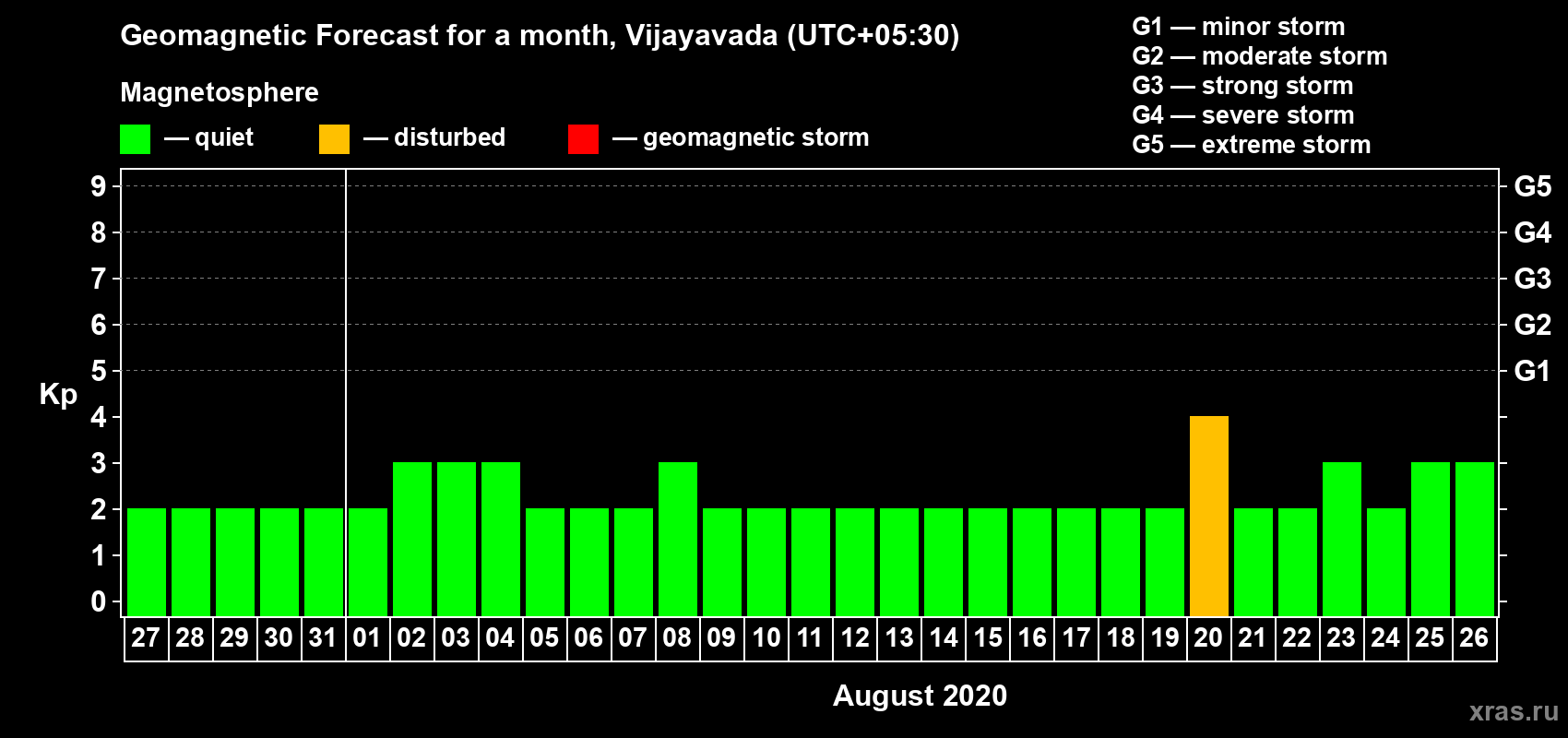 Geomagnetic storm forecast in Vijayavada for Jul 27, 2020
