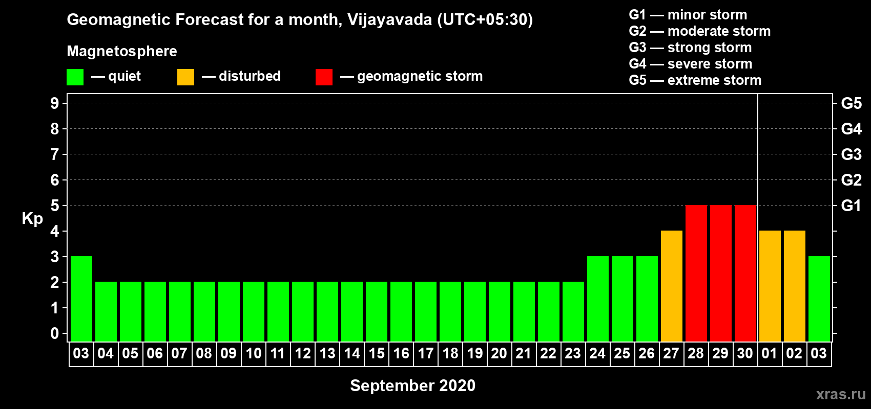 Geomagnetic storm forecast in Vijayavada for Sep 03, 2020