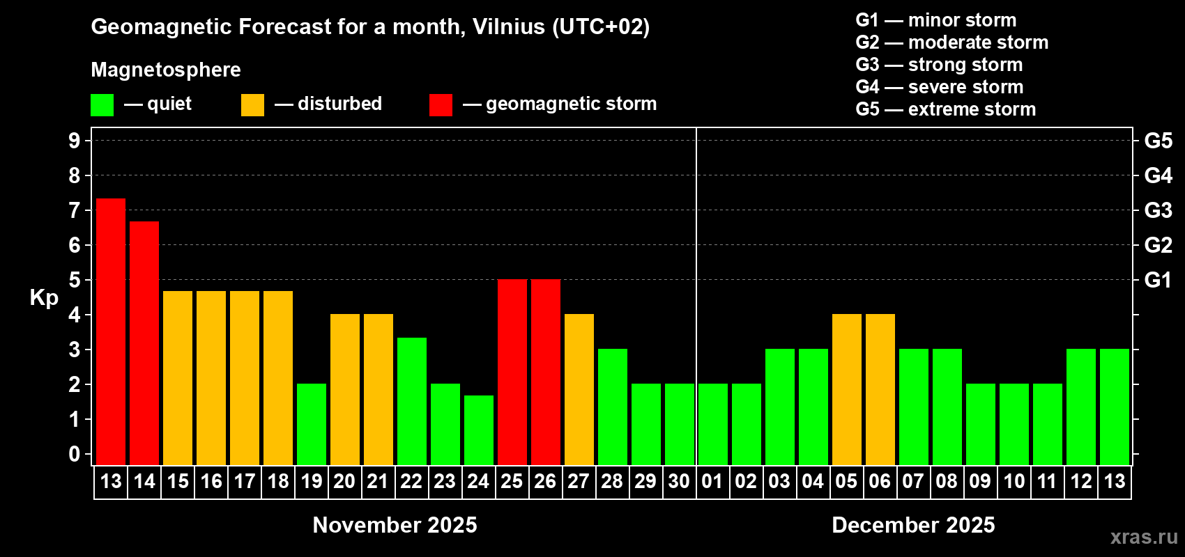 Geomagnetic storm forecast in Vilnius for Nov 13, 2025