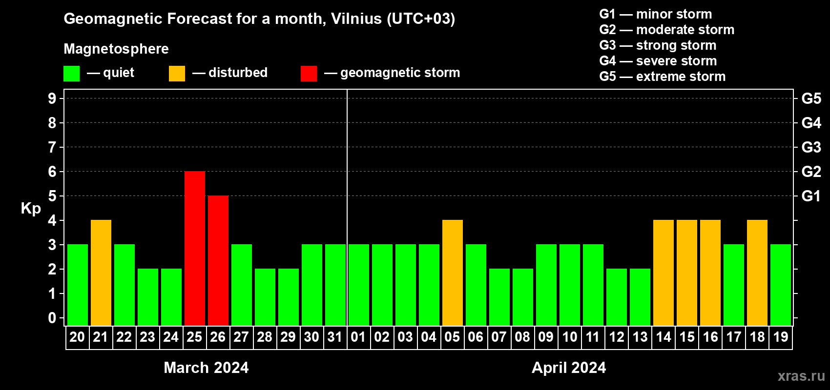 Geomagnetic storm forecast in Vilnius for Mar 20, 2024