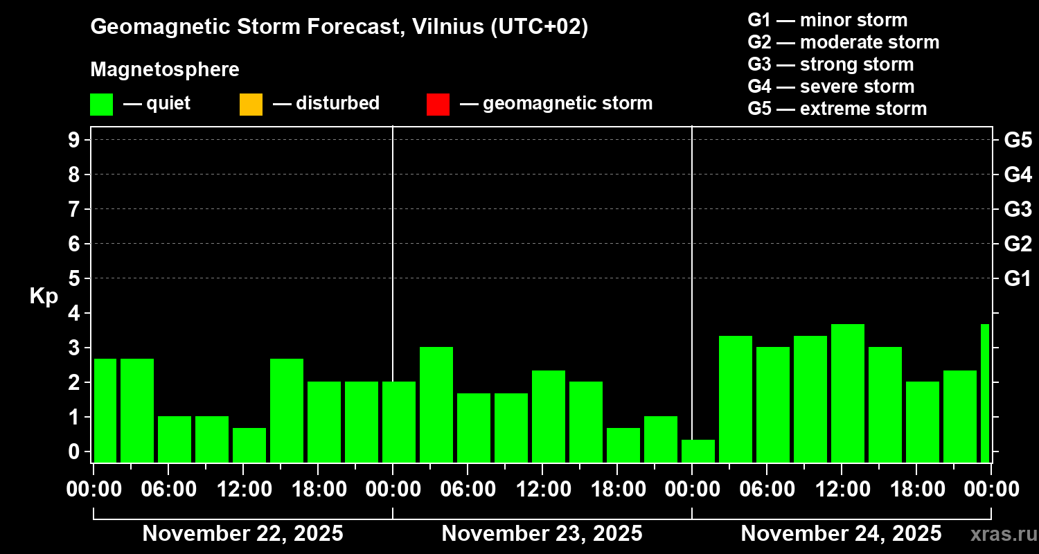 Geomagnetic storm forecast in Vilnius for Nov 22, 2025