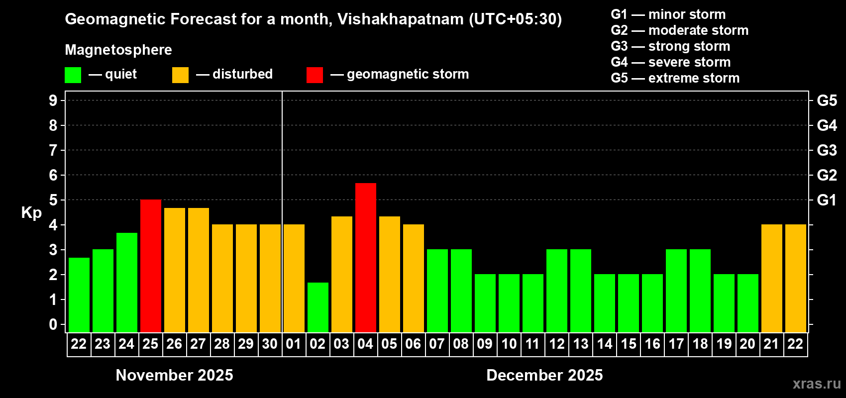 Geomagnetic storm forecast in Vishakhapatnam for Nov 22, 2025