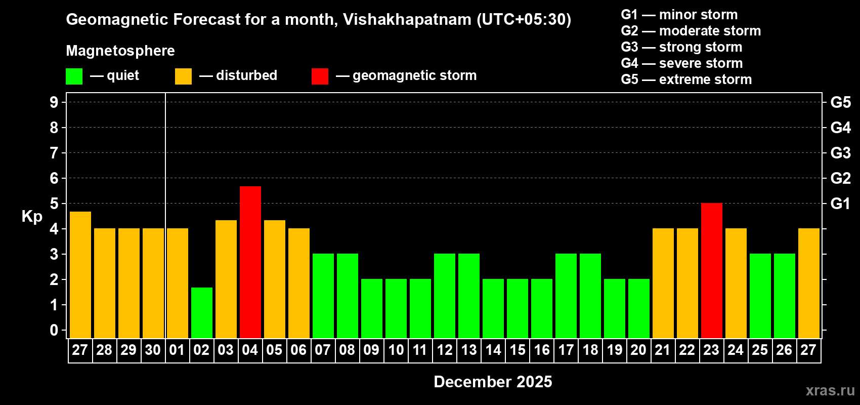 Geomagnetic storm forecast in Vishakhapatnam for Nov 27, 2025