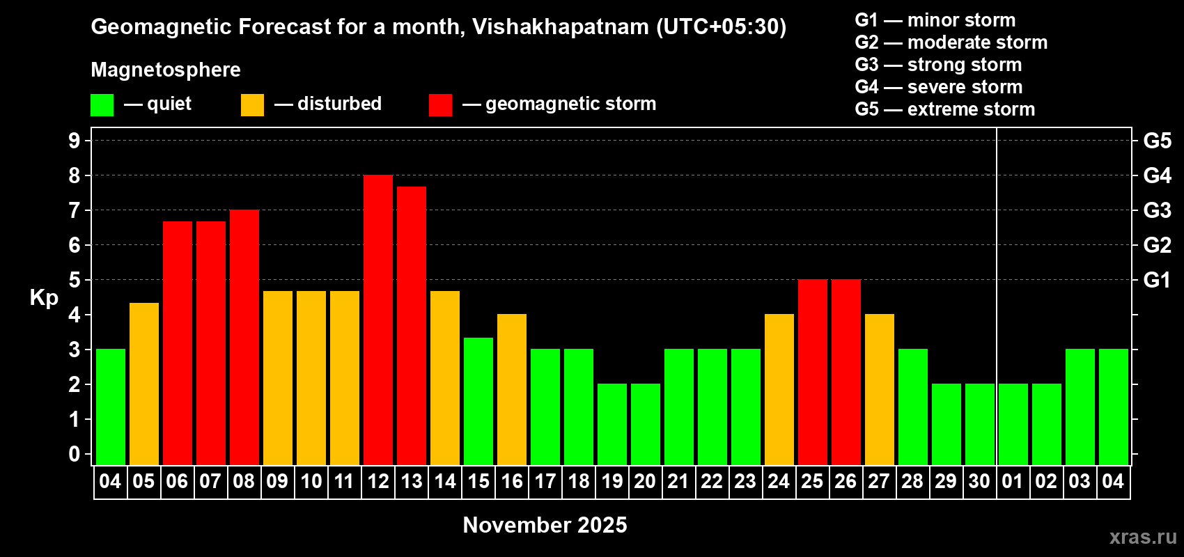 Geomagnetic storm forecast in Vishakhapatnam for Nov 04, 2025