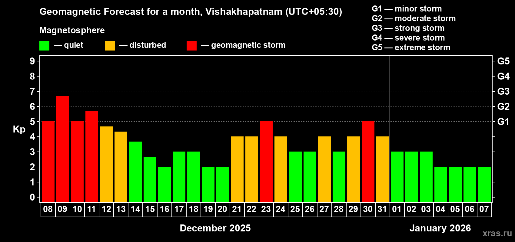 Geomagnetic storm forecast in Vishakhapatnam for Dec 08, 2025