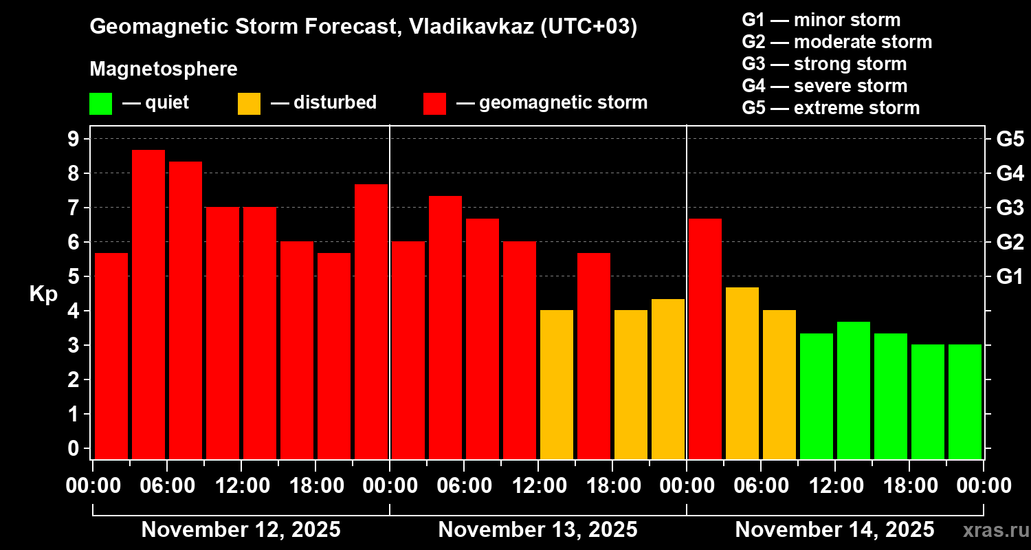 Geomagnetic activity forecast in Vladikavkaz — Nov 12, 2025