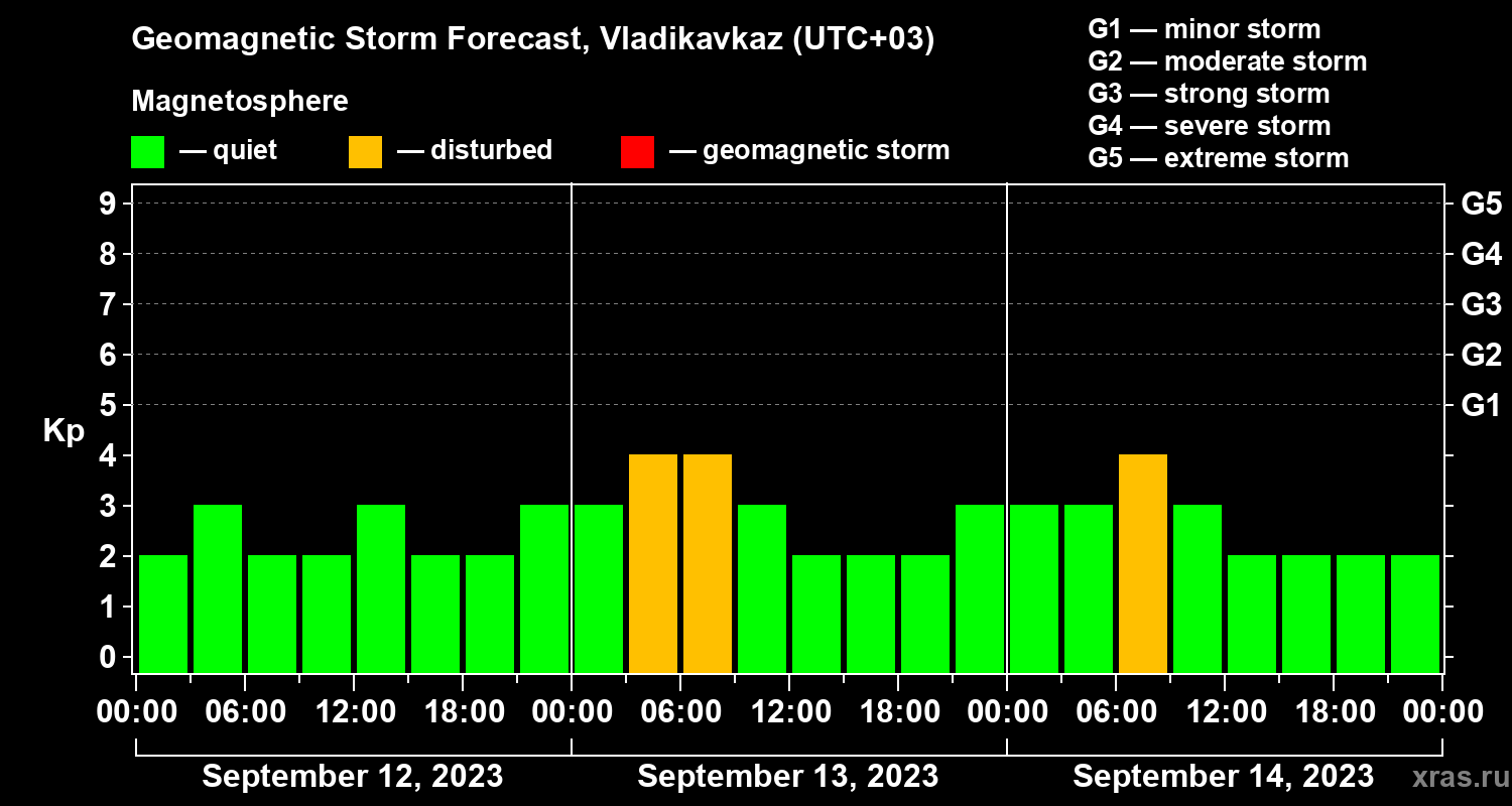 Geomagnetic storm forecast in Vladikavkaz for Sep 12, 2023