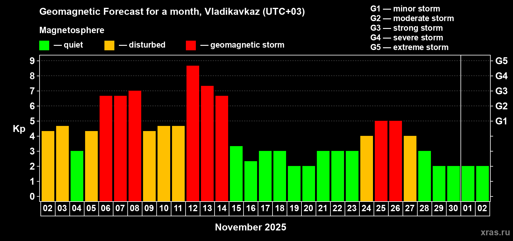 Geomagnetic storm forecast in Vladikavkaz for Nov 02, 2025