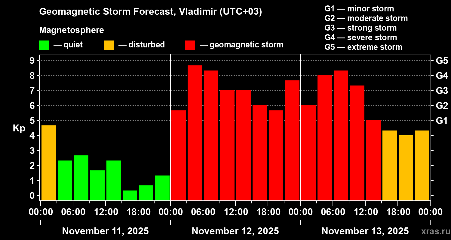 Geomagnetic activity forecast in Vladimir — Nov 11, 2025