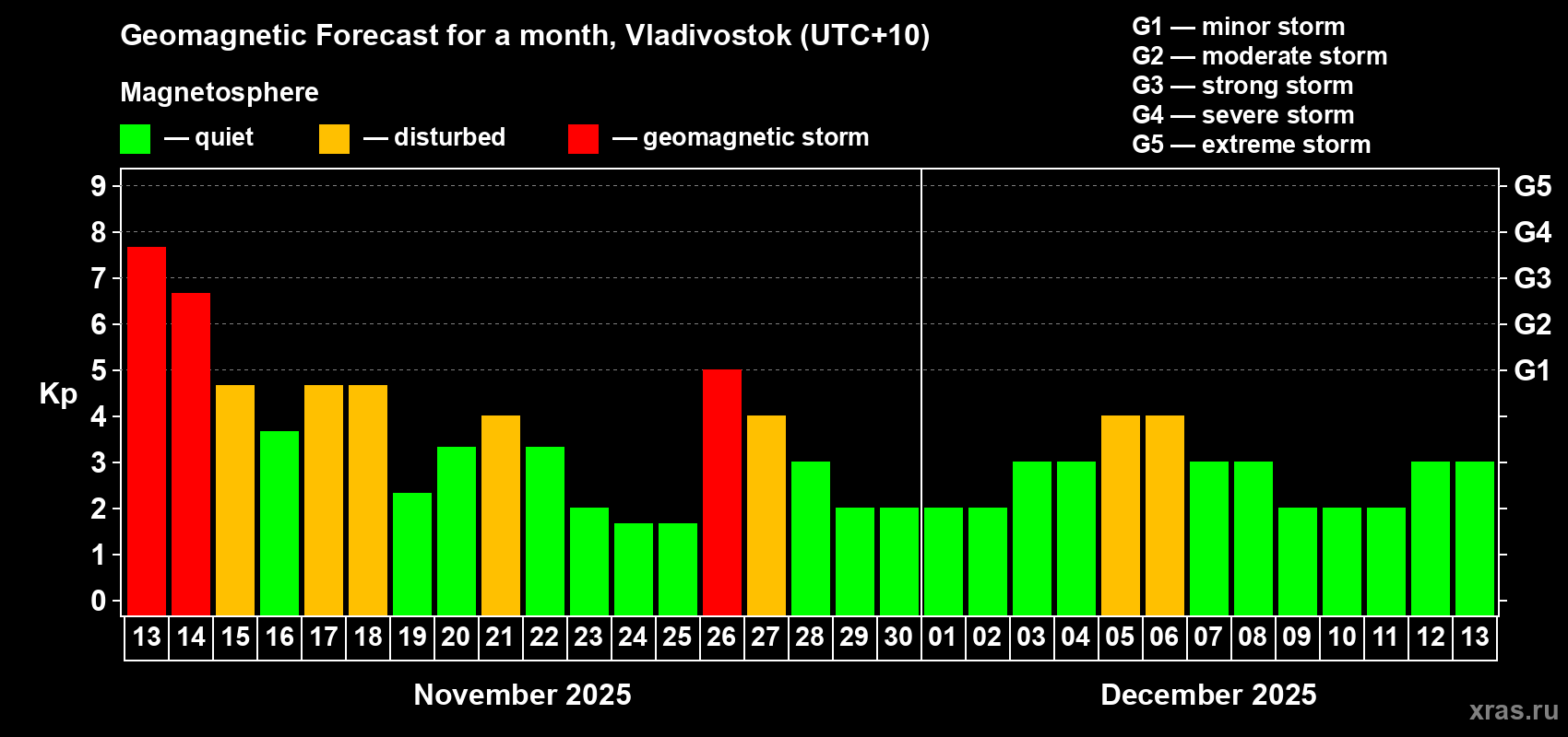 Geomagnetic storm forecast in Vladivostok for Nov 13, 2025