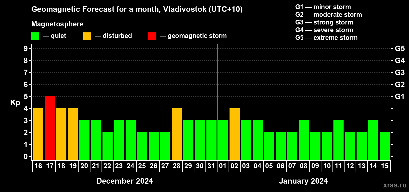 Geomagnetic activity forecast in Vladivostok — Dec 16, 2023