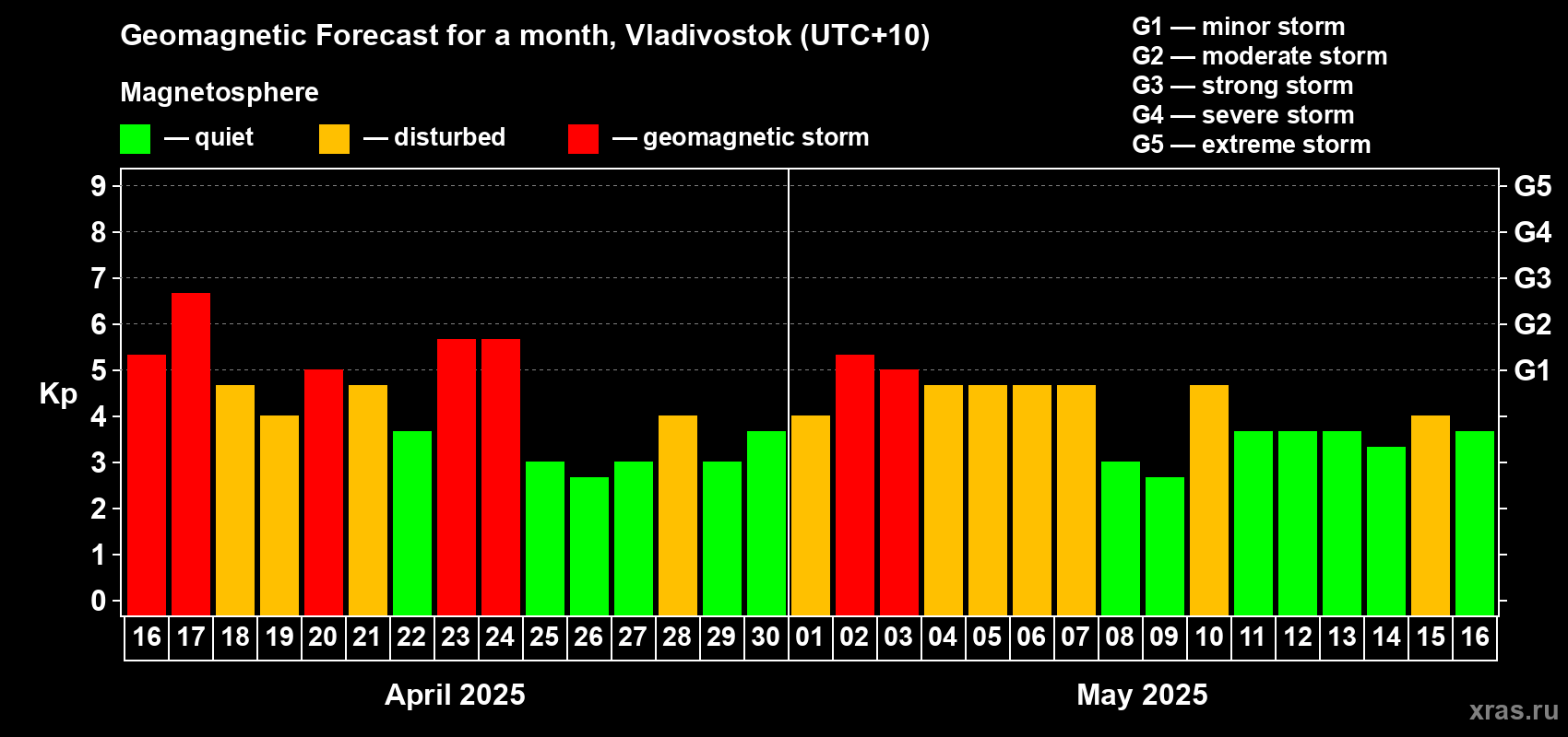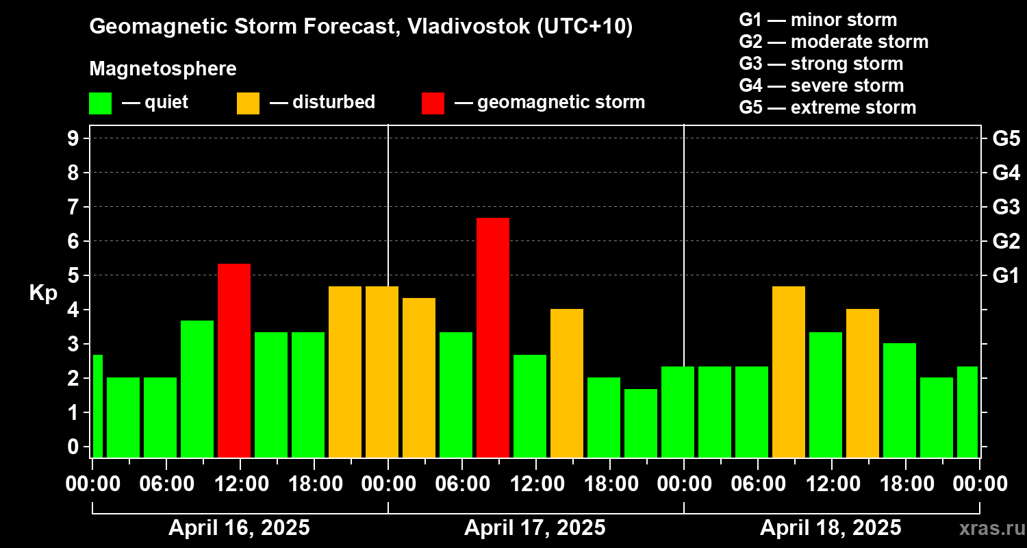 Geomagnetic activity forecast in Vladivostok — Apr 16, 2025